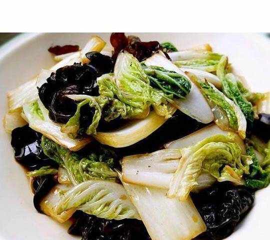 用料:白菜、木耳、葱、姜、花椒、八角、老抽、白糖、醋、盐、鸡精;