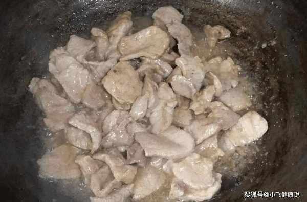 第五步:不粘锅加少许油,倒入几片猪肉片,让肉片快速炸熟,加入鲜鲜的蚝油,翻炒片刻,给肉片上色,备用.