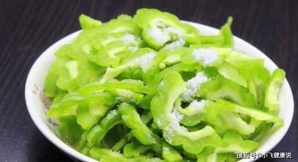 第二步:将苦瓜片放入碗中,撒上盐,盐可以杀黑水(去苦味),静置10分钟,沥干水分。