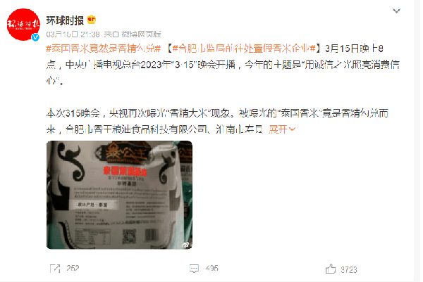 每年的3.15晚会都会让人“触目惊心”,很多不法商贩被曝光。而今年的315话题中,“泰国香米”就上了热搜。