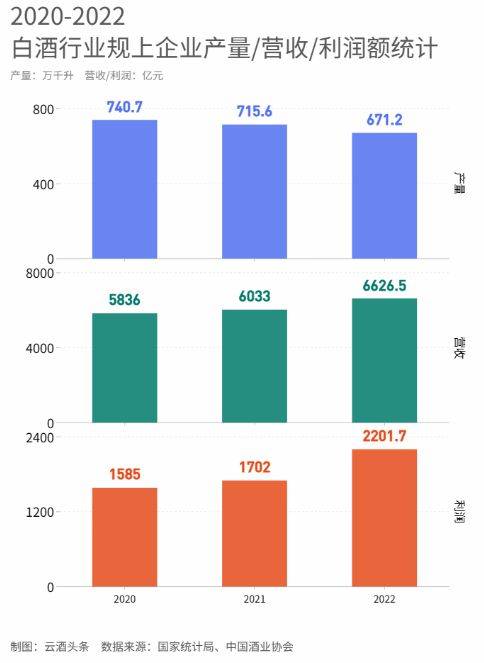 2020-2022年,白酒行业的营收分别为5836亿元、6033亿元、6626.5亿元;实现利润分别为1585亿元、1702亿元、2201.7亿元,营利双增,且增幅明显。