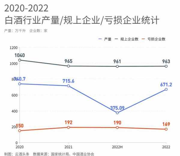 在白酒产量持续下滑的背景下,白酒企业的数量也不断减少。2020年,我国规上(即年产值2000万元以上)白酒企业为1040家;2021年,规上白酒企业为965家;2022上半年为961家,其中190家亏损,全年数量或许会进一步减少。