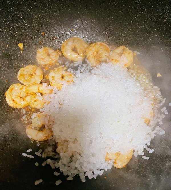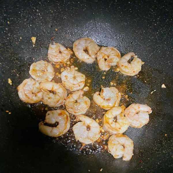 首先,将大蒜放入锅中爆香,然后倒入虾仁翻炒片刻。