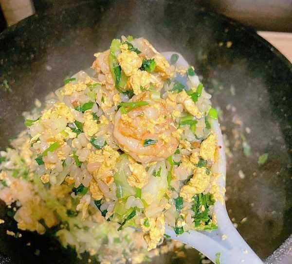所需食材:魔芋米、虾仁、鸡蛋、白菜、香菜、葱花。