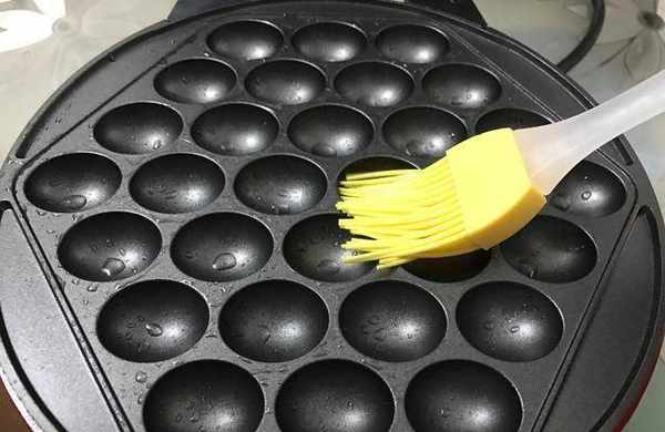 5、模具加热后,刷上少许油。面糊静置后,再次搅拌均匀,然后用勺子倒入模具中,机器盖子得马上盖上。