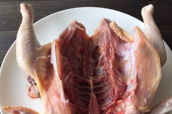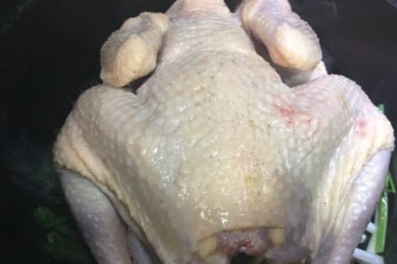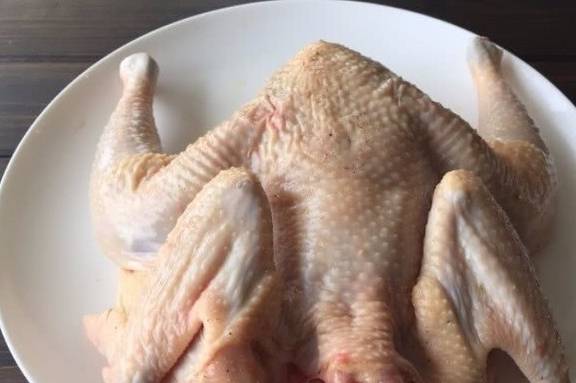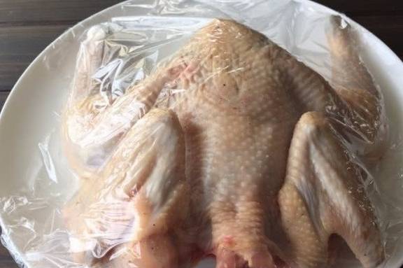 鸡身内外撒盐和胡椒粉,用手揉匀。