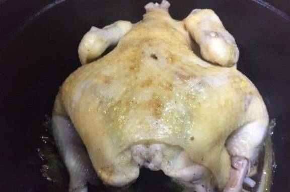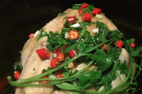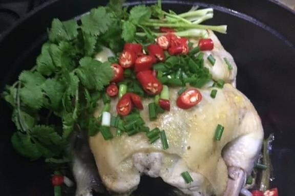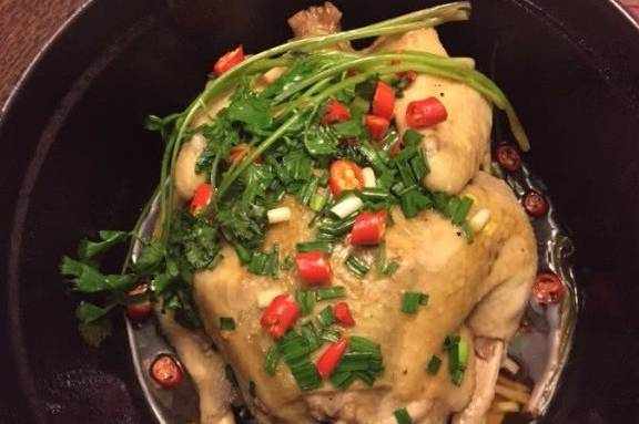 锅中色拉油,花椒油和芝麻油烧热迅速浇到鸡身上即可上桌。