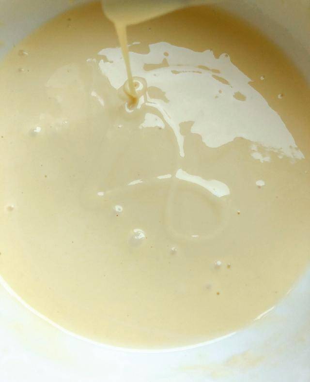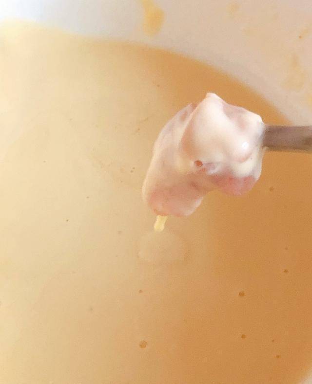 3、将蛋黄、淀粉、面粉、水和泡打粉一起加入,搅拌成糊状。最好厚一点,这样可以更好的挂在食材上。