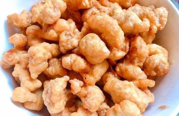 4、锅里加油,再倒一些,油热的时候把肉放在面糊里挂一圈,然后下锅炸。让每块肉的表面变成金黄色,然后将其取出。