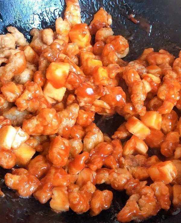 7、锅中需要留底油,然后放入酱汁,小火炒出香味。颜色会变得很红,然后加入菠萝肉一起炒。