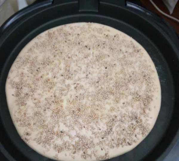 选择上下火的电饼铛,开最低档,不刷油,放入面团,盖上盖子。由于每个家庭的电饼铛火力不同,需要经常观察,一般是7、8分钟(面团开始变大,这是二次发酵的原因,这时候可以旋转一下每隔1分钟左右揉一次面团,这样直到面团熟透,表面酥黄。