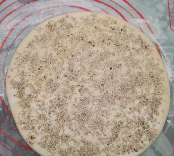 取出醒发好的面团揉面很重要。一定要充分排气,否则做出来的锅盔中间会有气孔。揉面团大约需要7到10分钟。不用等二次醒发,直接压擀成适中的面饼即可。表面刷上水,撒上一层芝麻,用擀面杖轻轻擀出芝麻。