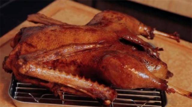 油炸的目的是为了使鹅皮色泽美观,形状更好。整只鹅在腌制的时候,用很多黑酱油腌制,不仅让鹅肉入味,也让鹅皮有了颜色。黑酱油是一种流动的液体。应该先炸一下,这样油可以固定老抽的颜色,这样老抽的颜色才不会不均匀。鹅皮的颜色很漂亮,让人看了更有食欲。