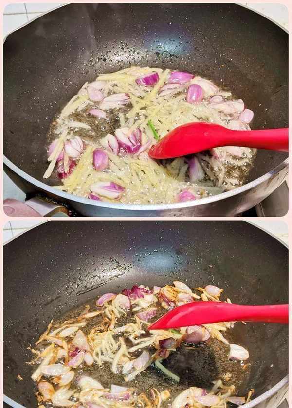 4、大火锅倒入适量的油,放入小葱和普丁炒香。
