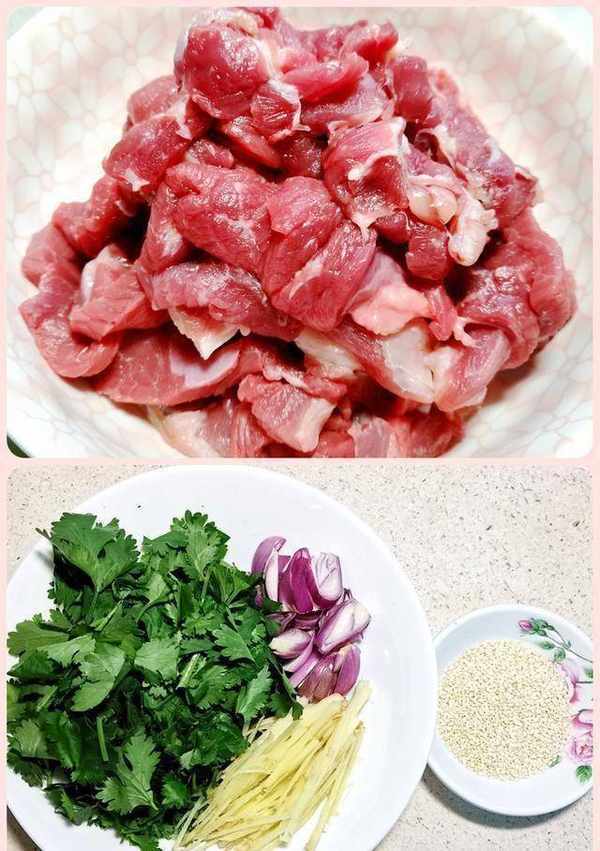 1、羊腿切片或切成薄片,姜切丝切碎,小葱切碎(不需要太细),香菜切小块待用。