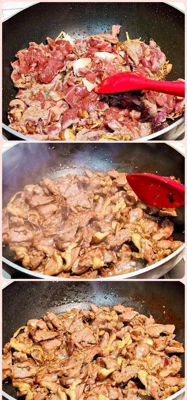 5、将腌制好的羊肉倒入锅中,大火翻炒至羊肉表面多余的水分收干,羊肉表面呈金黄色,有焦香。