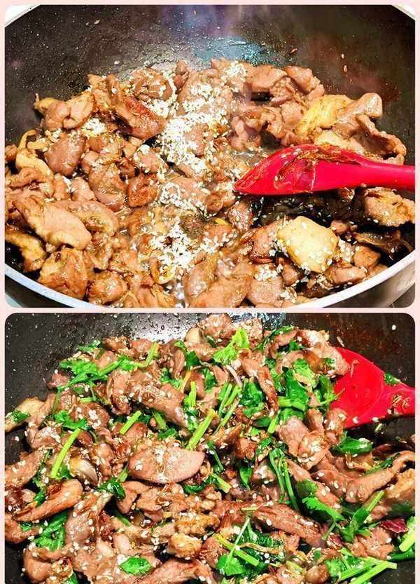 6、分别加入炒好的孜然和香菜,快速翻炒几秒,即可出锅。