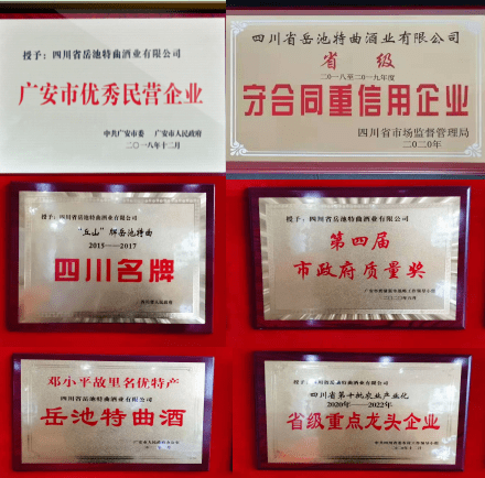 公司先后荣获:省级守合同重信用单位、四川省名牌、四川省著名商标、小平故里名优特产、巴蜀食品节金奖、四川工业产品博览会金奖、省级产品质量奖、中国文化名酒、广安市优秀民营企业等几十余项殊荣。