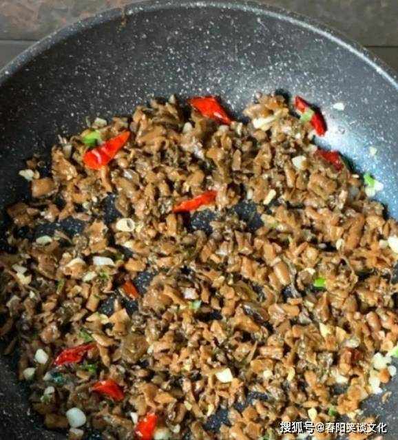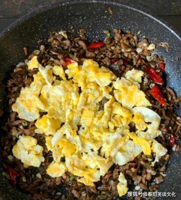 第六:将外婆菜倒入锅中,炒外婆菜里的水,放入提前炒好的鸡蛋,加半勺盐,半勺胡椒粉和半勺十三香,炒香。均匀一段时间。