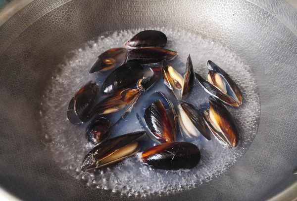 5、加入适量的水,放入蛤蜊煮开,捞出,将肉放入大碗中,开吃。