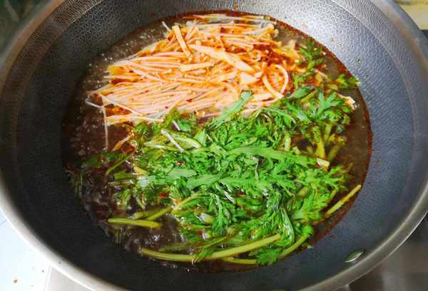 3.先加入金针菇、豆腐、菊花,煮熟捞出。