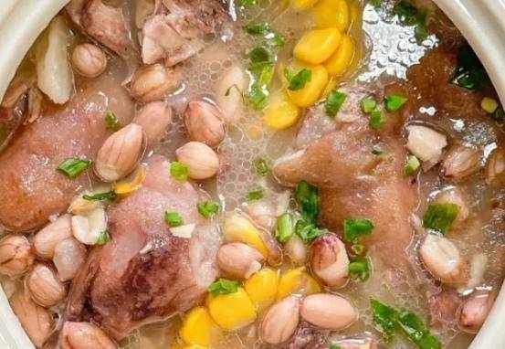 3、将猪脚、玉米和花生米放入汤锅中,加入姜片和足量的清水,盖上盖子炖煮两个小时。
