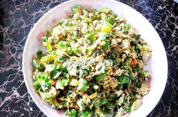 3.把蒜苗末和青椒丁炒软后再把鸡蛋液倒入锅中翻炒,不停的翻炒把鸡蛋炒碎炒熟出锅即可。