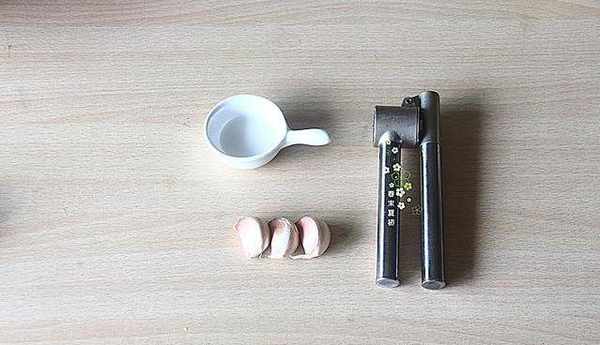 接下来准备做蒜蓉;取3瓣蒜瓣用刀切去根部再把蒜衣去掉,把蒜瓣放进压蒜器里压成蒜蓉,然后放小碟里备用。