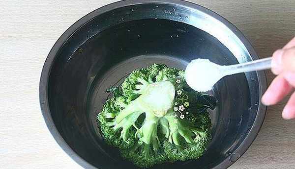 把所需要的食材准备好;准备小半盆的清水,然后清水里加入1克盐搅拌均匀,再把整个西兰花倒着放入水中浸泡15分钟以上。