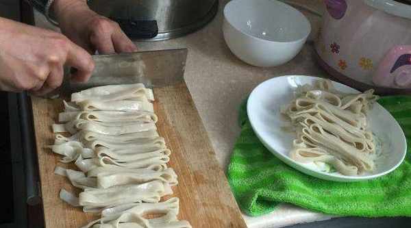 第五步切凉皮:切之前用凉开水撒少许在凉皮上,这样切出的凉皮不黏在一起,容易搅拌,宽度大约两厘米。