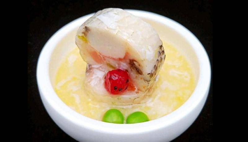 锅中烧热水,调味勾芡,加入蛋清顺时针搅拌均匀,浇在鲈鱼卷上,用火红苗和青豆装饰即可。