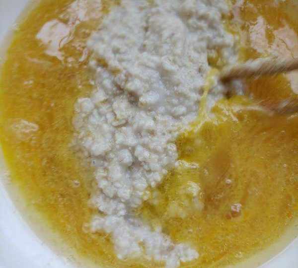 第7步、放麦芯粉和全麦粉,搅拌成絮状。