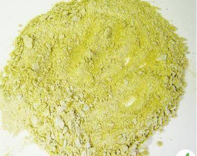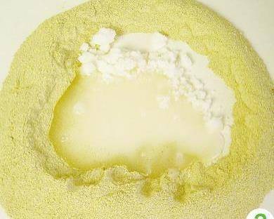 1绿豆面置于案板上,中间开窝,放入绵白糖。