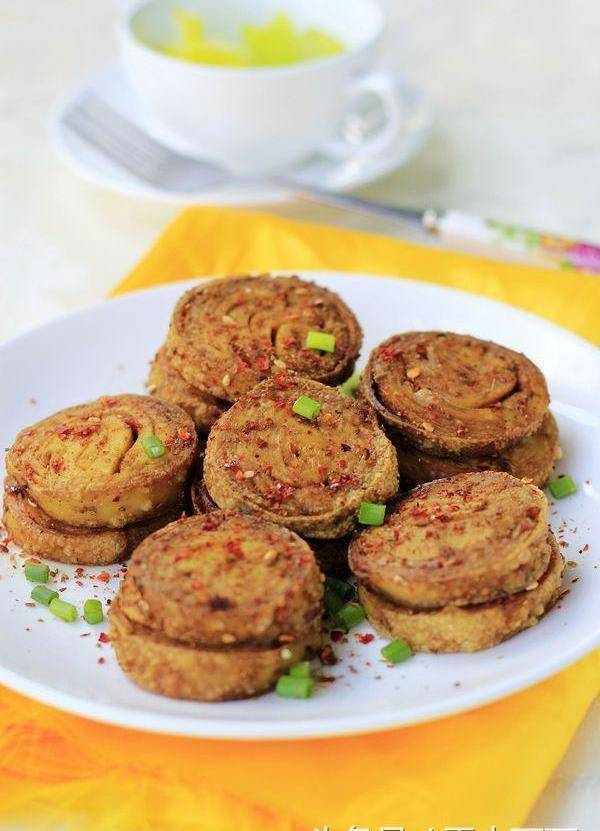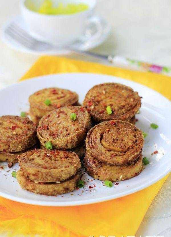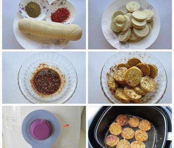 3、炸锅200度预热3分钟,拉出炸篮,把素鸡铺在上面,设置时间6分钟200度,时间到取出素鸡,撒上孜然粉和辣椒粉即可,下一锅炸的时候,时间设置4分钟就行了