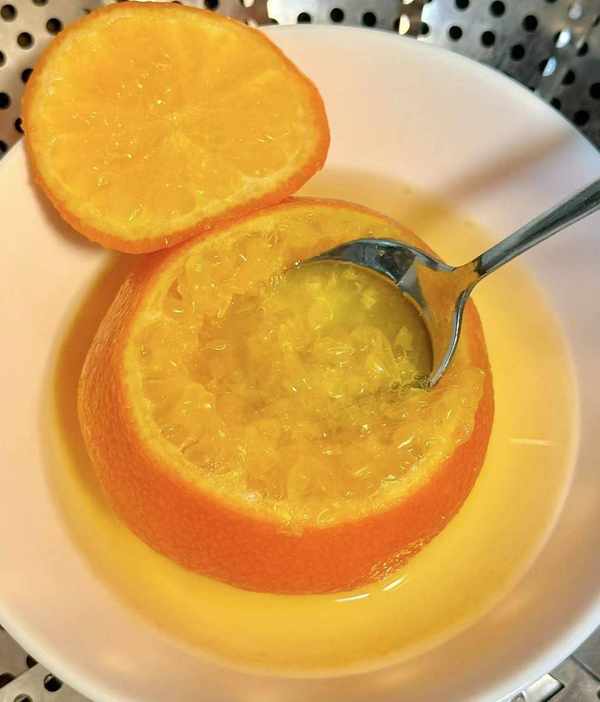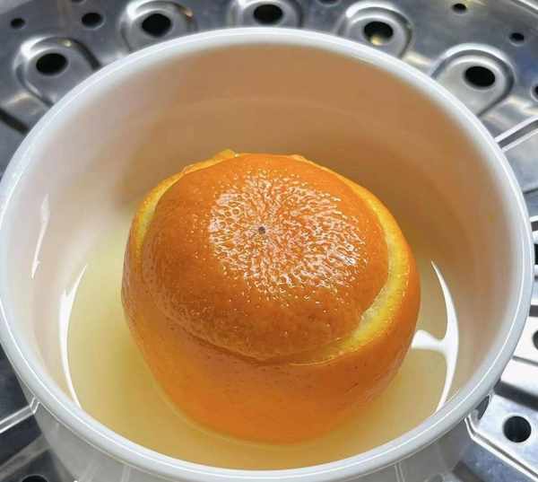 3:橙子是和皮一起蒸的,所以一定要将橙子皮彻底搓洗干净,蒸好后肉果和汤汁都要吃掉,这样药效才高。