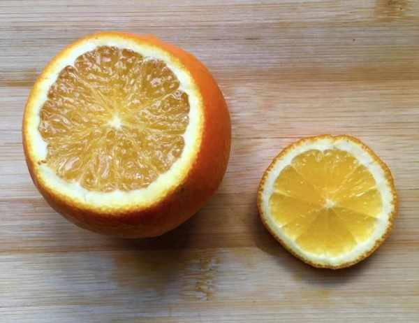 3:洗净的橙子,切开一小部分,不要扔掉,待会还要盖回去的。(建议选用新鲜的橙子,水分足,带皮蒸后效果明显)