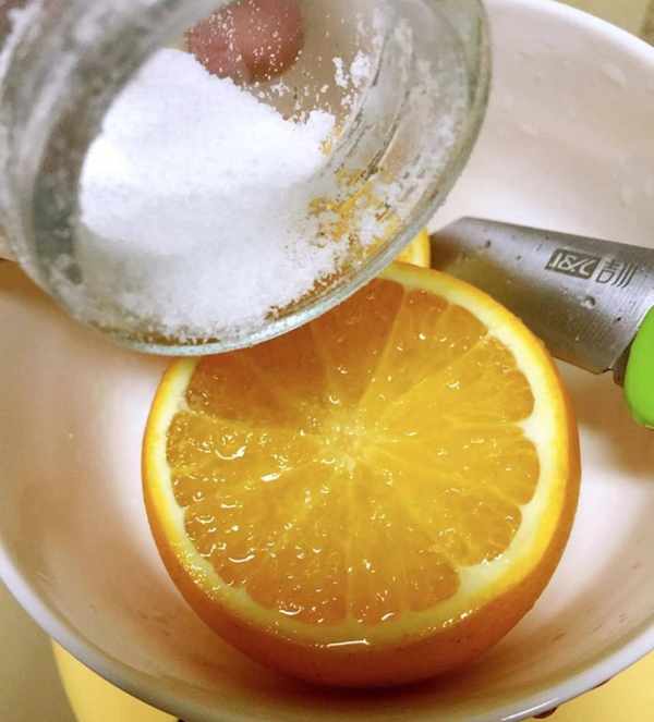 2:在橙子上撒一点盐,然后用盐将橙子外表皮搓干净,洗净橙子表面的油蜡。(药物都有三分毒,多少有些危害,不到万不得已,建议大家试试盐蒸橙子的食疗做法)