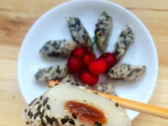 【夹沙糯米糕】软软糯糯的糯米糕,夹着甜丝丝的红豆沙,再蘸满香香的芝麻粒粒,吃一口,又粘又Q,好吃至极…