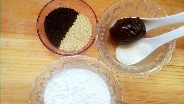 准备材料:糯米粉一小碗,红豆沙一勺子,白糖一勺,黑、白芝麻一小把