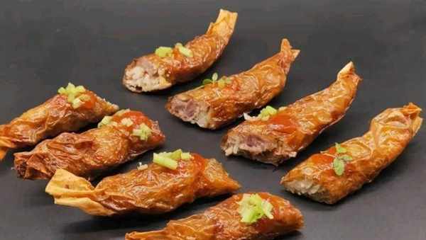 五花肉丁、马蹄丁、虾仁加入丹凤酒、五香粉、鸡粉、鸡蛋、白糖、洋葱碎、胡萝卜碎、地瓜粉搅拌成肉馅,将豆油皮铺在案板上,放入肉馅卷紧后用蛋液封口冷藏备用
