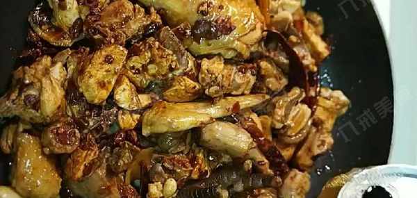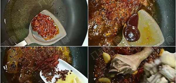 第三步:将锅洗干净后加入适量食用油,然后加入豆瓣酱和辣妹子酱炒出红油,然后加入姜、蒜、干辣椒、花椒八角,炒出香味后加入鸡块,翻炒均匀。