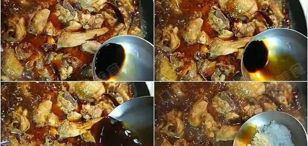 第五步:加入生抽、少许老抽、蚝油、盐、鸡精、白糖和十三香。