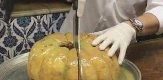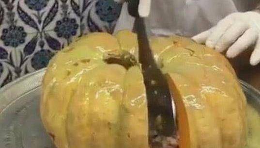 这聚餐请吃饭也不能吃蒸南瓜吧。然后都挺不开心的,觉得老板太抠了,这聚个餐也要这么小气吗?过了没一会儿,老板点的这个蒸南瓜就,被端上了桌子。真的是一整个很大的南瓜,谁知道这服务员把南瓜端上桌子之后,拿了一把刀,这是要干嘛呢?