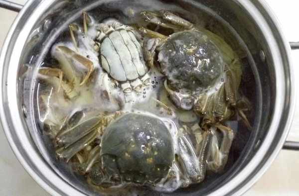 酒半瓶,再加入清水,直接用此汤水上笼蒸腌制好的大闸蟹15分钟。