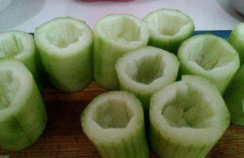 丝瓜去皮,切成小段,将小段树立好,用刀子或者别的工具在丝瓜的朝上一面挖出一个洞。