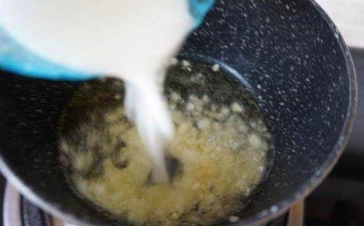 时间到后,关火,将丝瓜酿肉重新放在一个干净的盘子里。另取锅加少量食用油,倒入蒜末煸香,将刚才蒸丝瓜的汤汁倒进锅里,放一点葱末,加水淀粉勾芡。