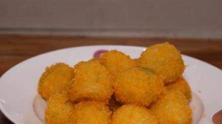 接着另外起锅,往锅中倒入小半锅食用油大火烧开,等油温六成热时把土豆泥制作成土豆丸子状,接着将土豆丸子放入鸡蛋液中滚上一圈再放入面包糠中再次滚上一圈用手压紧时,然后放入锅中进行油炸。直至将土豆丸子炸至金黄漂浮起来捞出控油即可。简单美味的土豆新吃法就制作完成了。