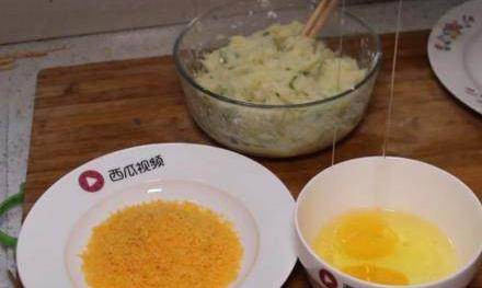 十五分钟之后取出土豆,将土豆倒入一个干净的碗里,然后用擀面杖将土豆压成土豆泥。接着再往土豆泥中加入适量的食用盐,胡椒粉,淀粉和切好的葱花用筷子搅拌均匀。接着准备一个干净的盘子,往盘子中倒入适量的面包糠备用。再准备一个干净的小碗,往碗里打入两个鸡蛋用筷子搅拌均匀制作成鸡蛋液备用。