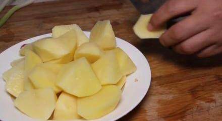 在制作美味的土豆新吃法之前,首先要准备两个新鲜土豆,将土豆去皮,然后清洗干净。洗干净后放在案板上切成滚刀状装入盘中备用。