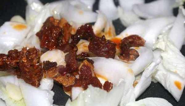 第三步:翻炒过后,放入已经准备好的酒糟鱼,因为这是腌制过的,本身就已经可以食用,所以翻炒一会后就可以开始调味了。